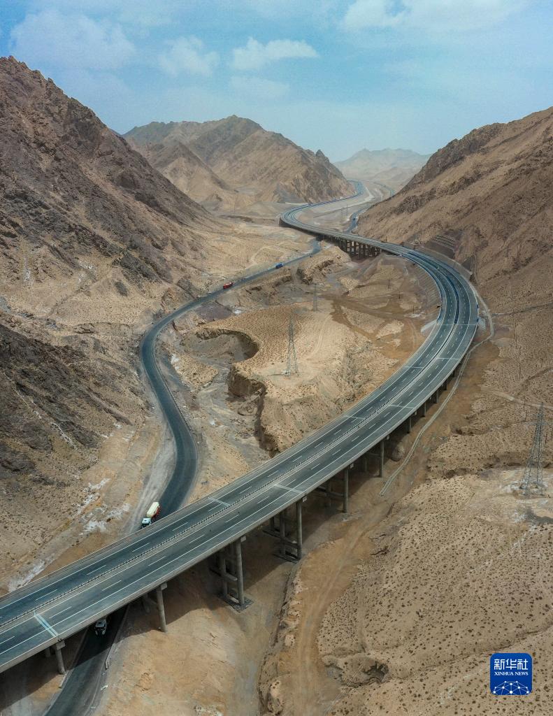 新疆依吞布拉克至若羌高速公路穿越阿尔金山(2022年5月9日摄,无人机照片)。