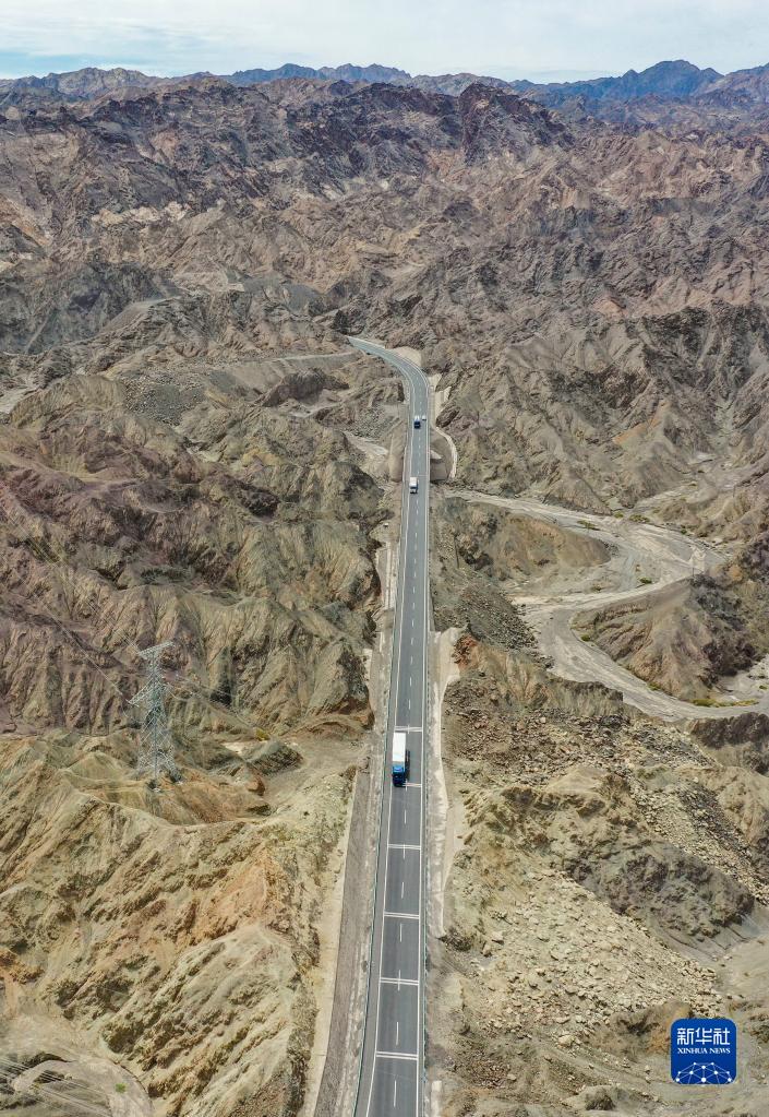 车辆行驶在贯穿新疆托克逊县干沟的山区高速公路上(2021年7月19日摄,无人机照片)。
