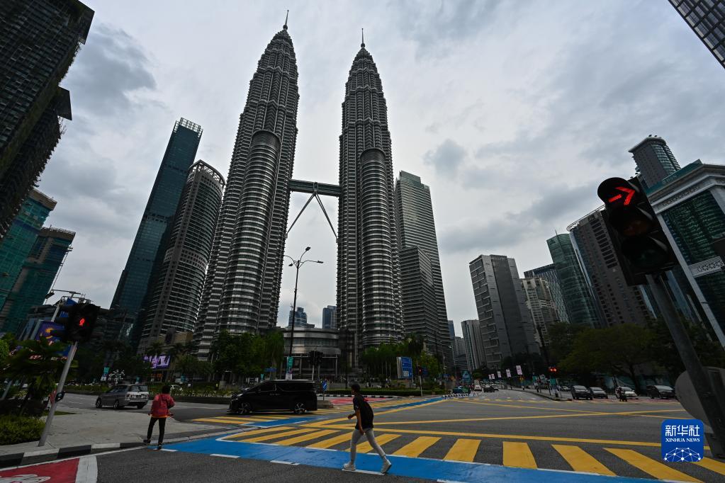 10月10日,在马来西亚吉隆坡,人们从马来西亚国家石油公司双塔前走过。新华社记者 朱炜 摄