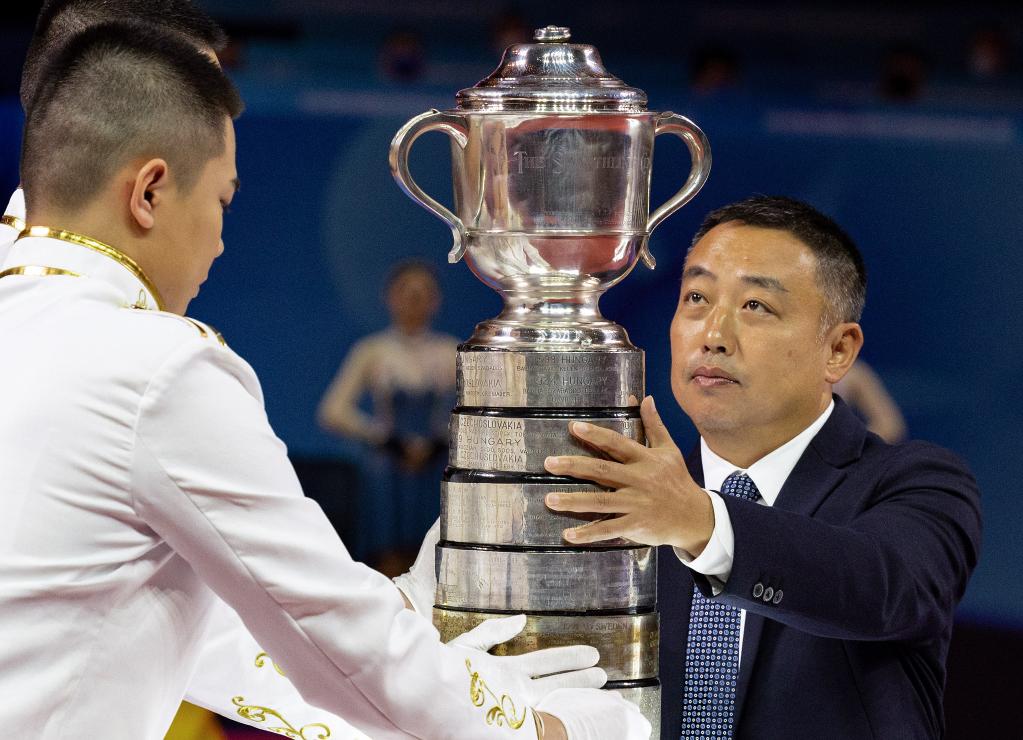 9月29日,中国乒协主席刘国梁(右)将男子团体冠军奖杯——斯韦思林杯放在展台上。新华社记者 江宏景 摄