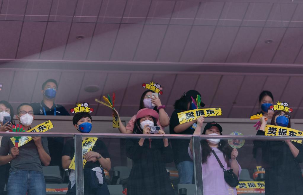 10月8日,现场观众为中国队选手樊振东加油助威。新华社记者 江宏景 摄