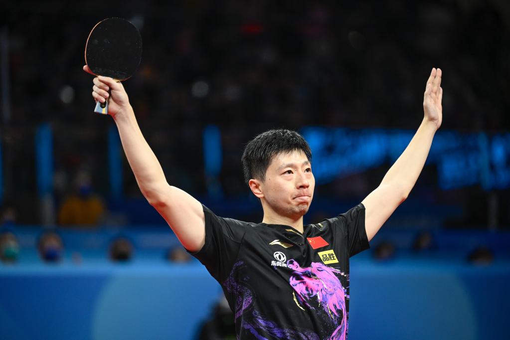 10月9日,中国队选手马龙在比赛中庆祝胜利,他以3比1战胜德国队选手邱党。新华社记者 刘续 摄