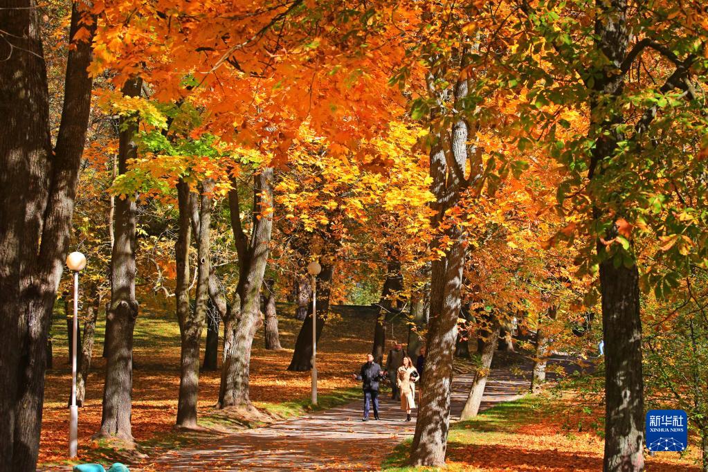 10月10日,人们在白俄罗斯明斯克一处公园散步。