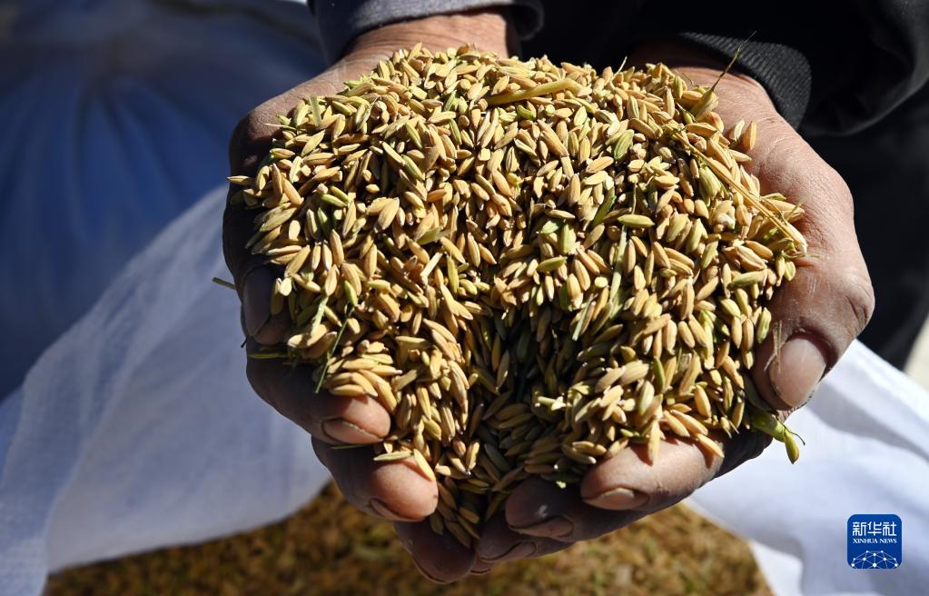 10月11日,农民在水稻开镰仪式上展示收获的稻谷。