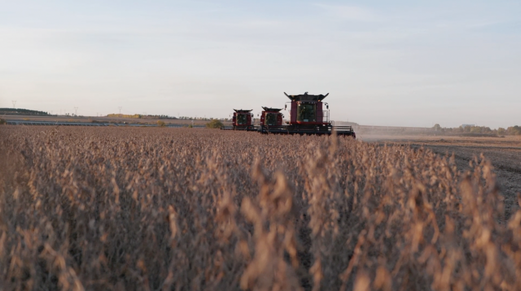 黑河市爱辉区的大片农田里,三台联合收割机同时向前推进,一行行大豆被卷进收割机的割台中,秸秆被粉碎后,直接抛撒在田中作为黑土地的养料。