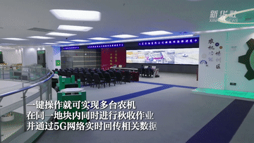 金秋收获季,在黑龙江北大荒农业股份七星分公司万亩大地号智慧农业示范区,无人农机正对水稻进行直收作业,工作人员不需要在现场查看收获质量,只需通过智慧农业管理指挥中心云平台,将收获、运粮多台无人农机编入一个作业集群,一键操作就可实现多台农机在同一地块内同时进行秋收作业,并通过5G网络实时回传相关数据。