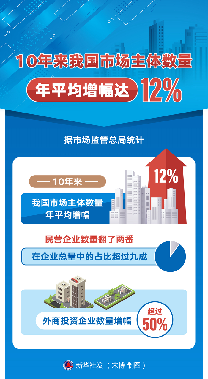 新华社北京10月13日电(记者赵文君)据市场监管总局统计,10年来,我国市场主体数量年平均增幅达12%;民营企业数量翻了两番,在企业总量中的占比超过九成;外商投资企业数量增幅超过50%。