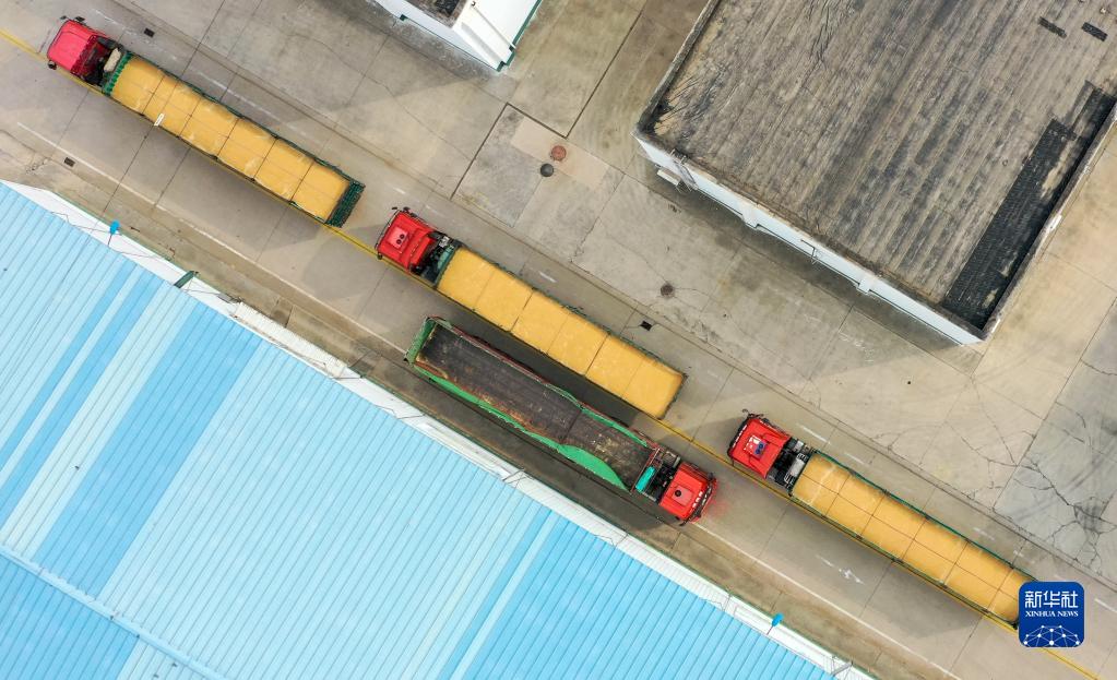 在中央储备粮天津东丽直属库有限公司大港分公司,运粮车在库区仓房间驶过(10月12日摄,无人机照片)。