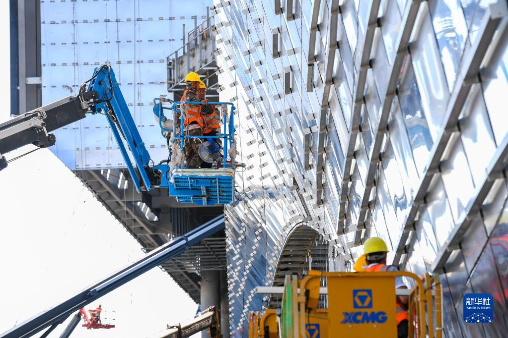建设者在广东美术馆、广东非物质文化遗产展示中心、广东文学馆“三馆合一”项目进行幕墙施工(10月12日摄)。