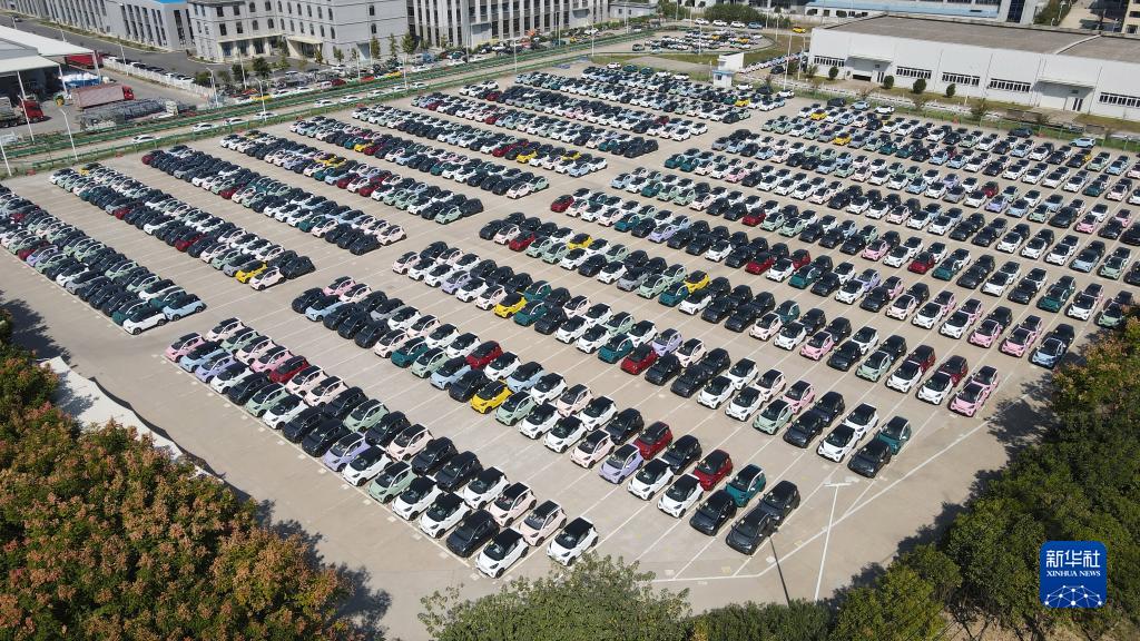 10月12日在位于芜湖市的奇瑞汽车股份有限公司新能源一期工厂拍摄的等待交付的新能源汽车(无人机照片)。