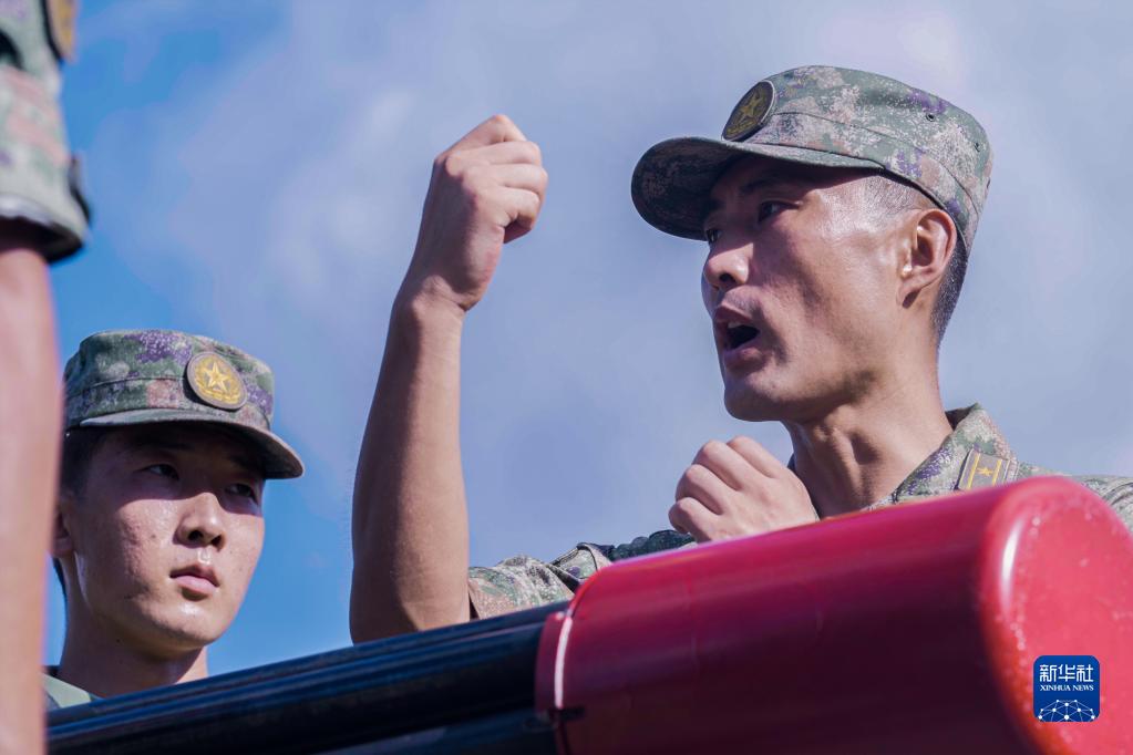 某次演训中,驻香港部队某团防空营营长王海旭(前)下达“发射”防空导弹命令(2022年7月21日摄)。新华社发(田越洋 摄)