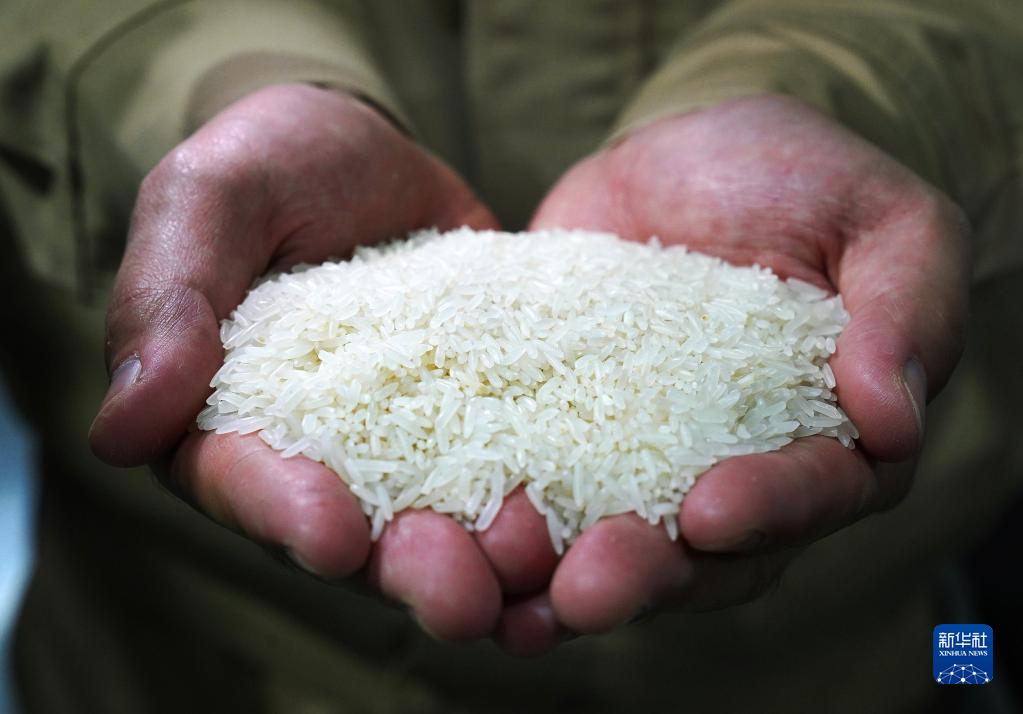 在位于江西省南昌县的一个粮食加工工厂,工人展示加工后的大米(10月11日摄)。