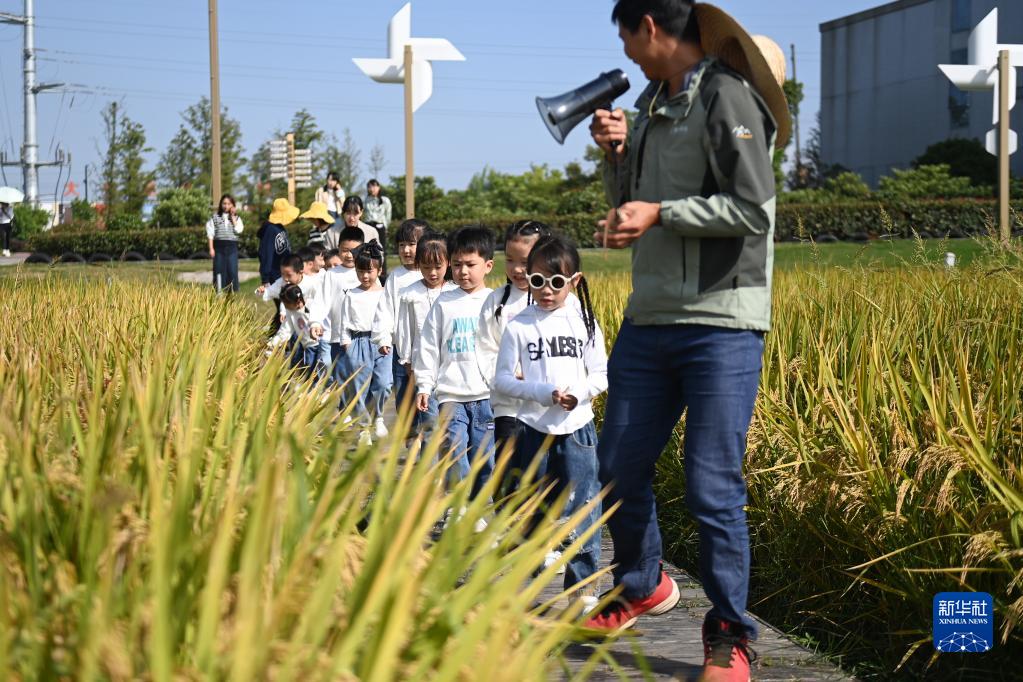 10月14日,浙江省湖州市吴兴高新区灵粮农场的农技人员(右一)带领小朋友参观稻田,介绍种粮知识。