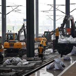 10月14日,施工者在天津西站操作机械设备进行换枕作业。