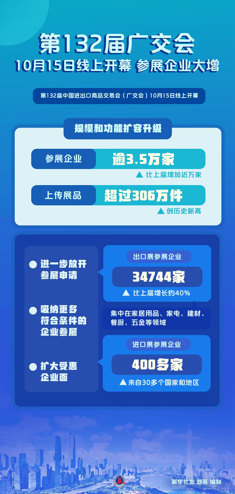 新华社广州10月15日电(记者马晓澄、丁乐)第132届中国进出口商品交易会(广交会)15日线上开幕,规模和功能扩容升级,参展企业逾3.5万家,比上届增加近万家;上传展品超过306万件,创历史新高。