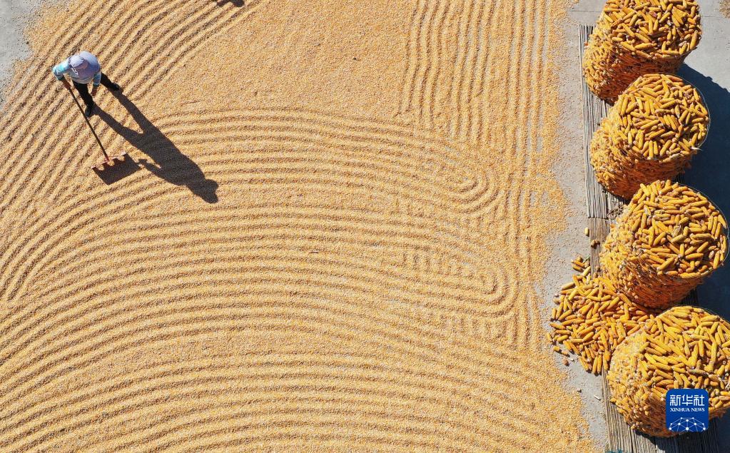10月10日,山东省临沂市郯城县郯城街道农民在晾晒收获的玉米(无人机照片)。