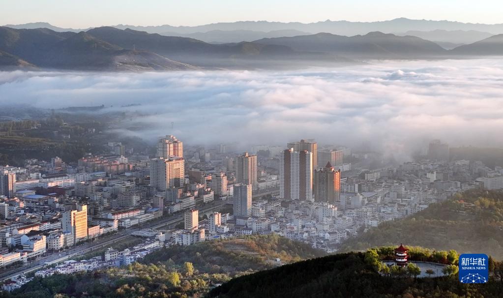 深秋时节,久雨初霁的陕西省商洛市洛南县城云雾缭绕,巍峨秦岭、奔腾洛河、山城建筑若隐若现,唯美梦幻。