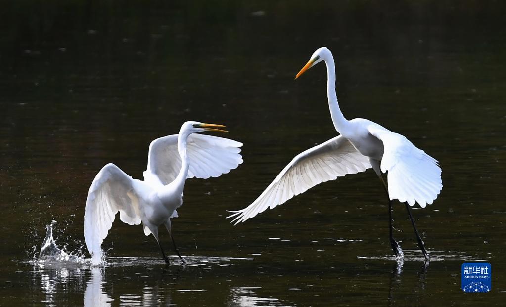 金秋时节,鹭鸟在山东省滕州市的荆河觅食、嬉戏(10月9日摄)。