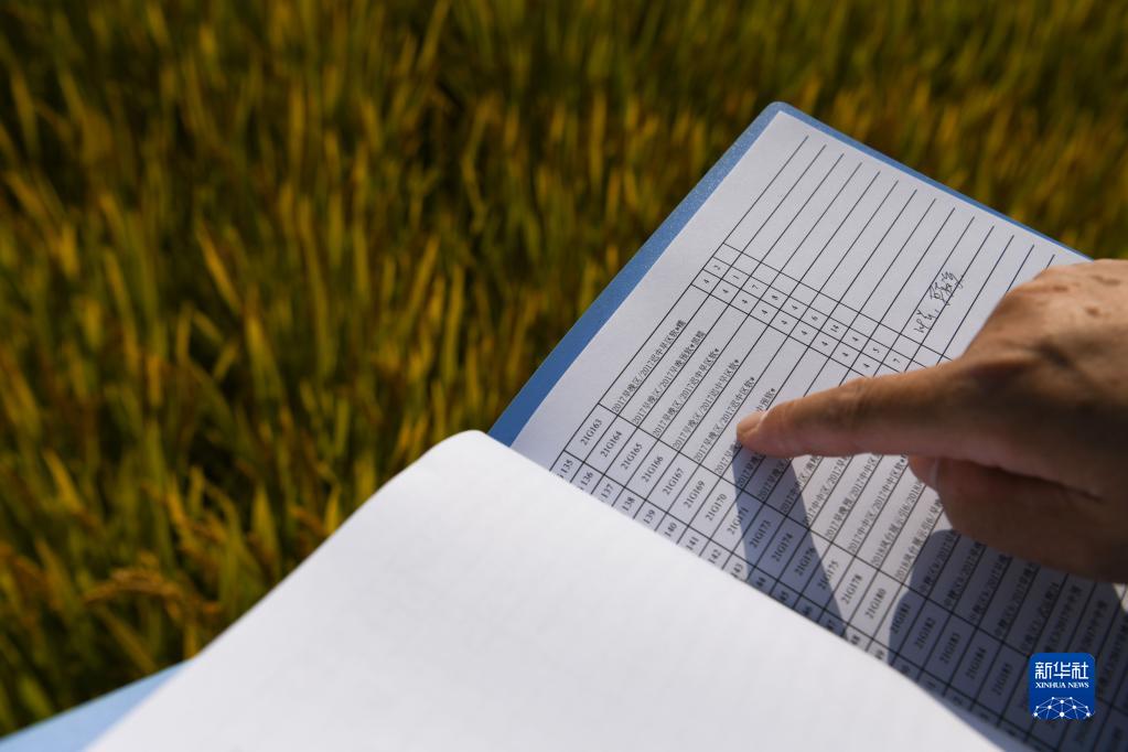 10月15日,在牛角大圩水稻试验示范基地内,安徽省农业科学院水稻研究所工作人员夏加发在介绍种质资源。
