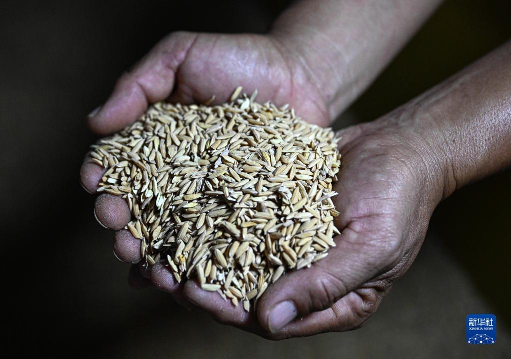 10月15日,工人在位于海南省东方市的海南农乐南繁科技有限公司展示水稻种子。新华社记者 蒲晓旭 摄