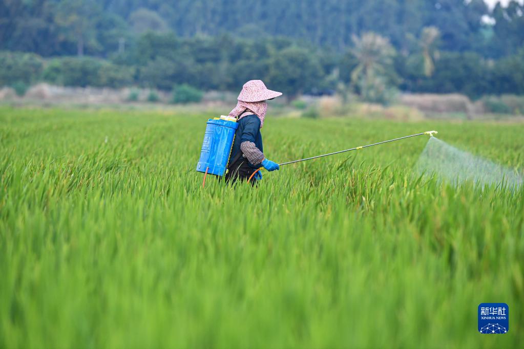 10月15日,工人在位于海南省东方市的海南农乐南繁科技有限公司制种基地喷洒植物生长调节剂。新华社记者 蒲晓旭 摄