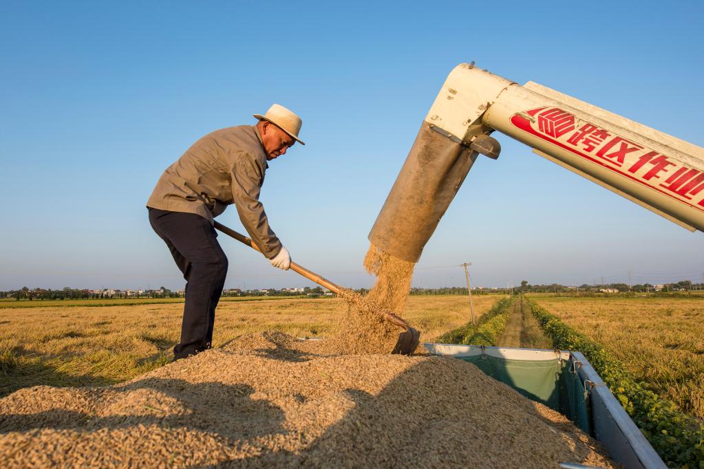在芜湖市繁昌区平铺镇,村民将收割的水稻装车。新华社发(肖本祥 摄)