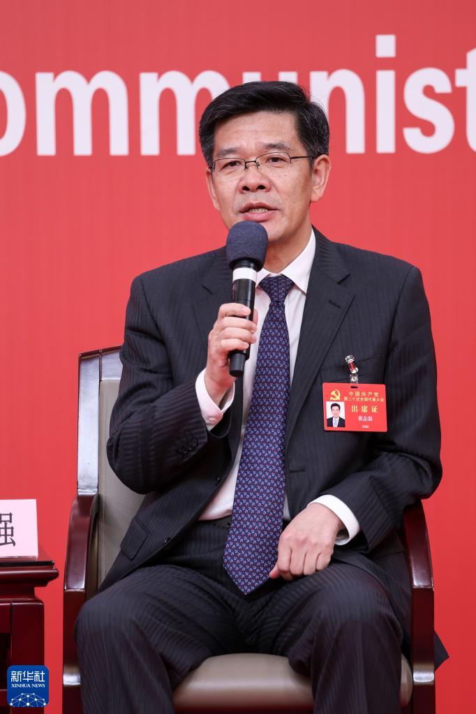 10月18日,中国共产党第二十次全国代表大会新闻中心举行集体采访,请北京、天津、河北、山西、内蒙古、辽宁、吉林代表团新闻发言人出席,介绍代表团学习讨论二十大报告情况,并回答记者提问。这是内蒙古自治区党委常委、自治区常务副主席黄志强在回答记者提问。新华社记者 张玉薇 摄