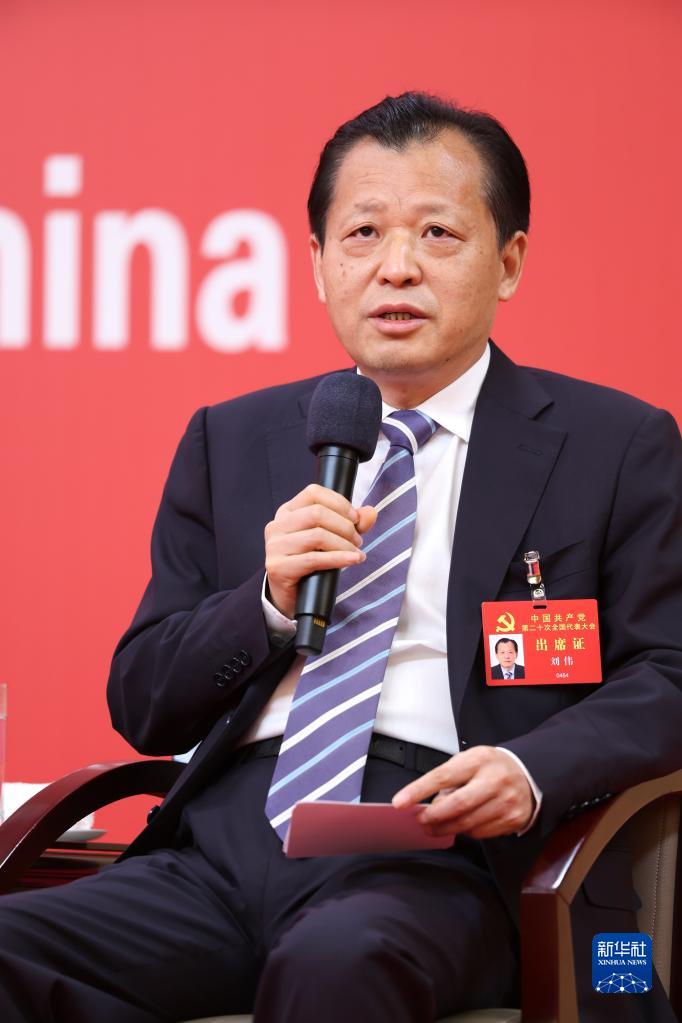 10月18日,中国共产党第二十次全国代表大会新闻中心举行集体采访,请北京、天津、河北、山西、内蒙古、辽宁、吉林代表团新闻发言人出席,介绍代表团学习讨论二十大报告情况,并回答记者提问。这是吉林省委副书记刘伟在回答记者提问。新华社记者 陈建力 摄