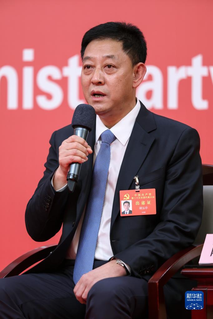 10月18日,中国共产党第二十次全国代表大会新闻中心举行集体采访,请北京、天津、河北、山西、内蒙古、辽宁、吉林代表团新闻发言人出席,介绍代表团学习讨论二十大报告情况,并回答记者提问。这是辽宁省委副书记、大连市委书记胡玉亭在回答记者提问。新华社记者 陈建力 摄