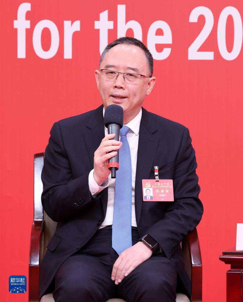 10月18日,中国共产党第二十次全国代表大会新闻中心举行集体采访,请北京、天津、河北、山西、内蒙古、辽宁、吉林代表团新闻发言人出席,介绍代表团学习讨论二十大报告情况,并回答记者提问。这是天津市委副书记金湘军在回答记者提问。新华社记者 张玉薇 摄