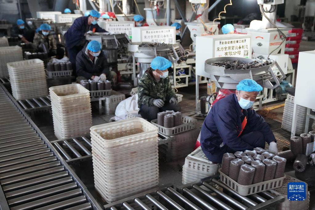 10月17日,在黑龙江省拜泉县的鑫鑫菌业菌包生产车间,工人在生产菌包。