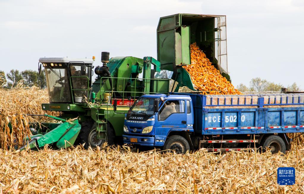 10月17日,在通辽市科尔沁左翼中旗舍伯吐镇,农机手操作收割机在田间收获玉米。