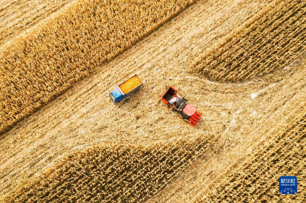 10月14日,在通辽市科尔沁区敖力布皋镇,农机手操作收割机在田间收获玉米(无人机照片)。
