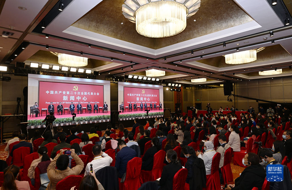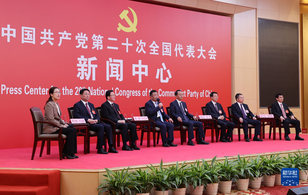 10月19日,中国共产党第二十次全国代表大会新闻中心举行集体采访。山东、河南、湖北、湖南、广东、广西、海南代表团新闻发言人出席,介绍代表团学习讨论二十大报告情况,并回答记者提问。新华社记者 陈建力 摄