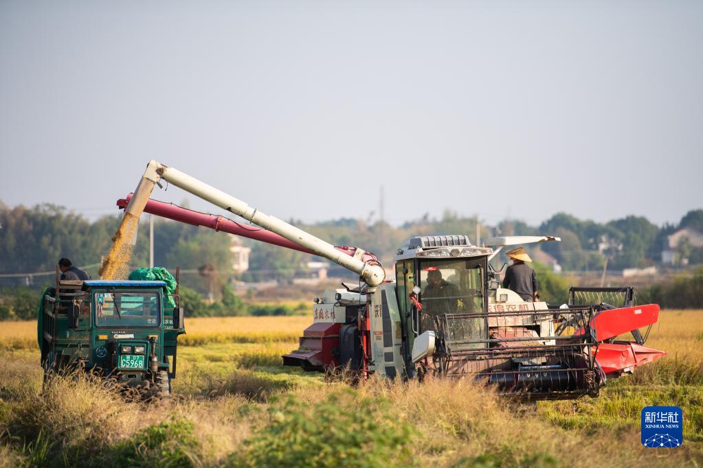 10月20日,在湖南省常德市鼎城区谢家铺镇,收割机把收好的稻谷转放到运输车里。