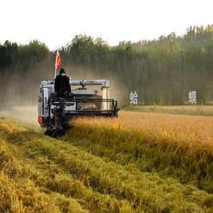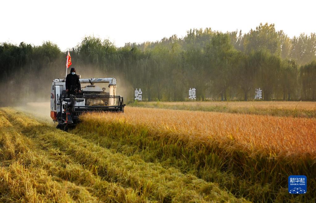 在西安市长安区王曲街道皇甫村,村民驾驶收割机收割水稻(10月21日摄)。