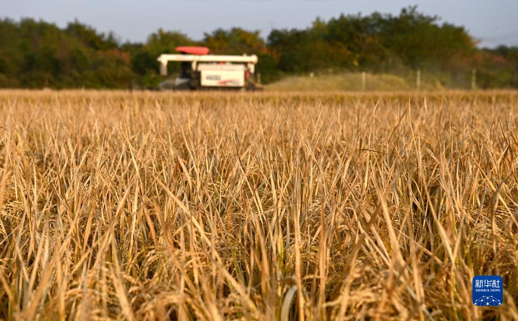 在西安市长安区王曲街道皇甫村,收割机在收割水稻(10月21日摄)。