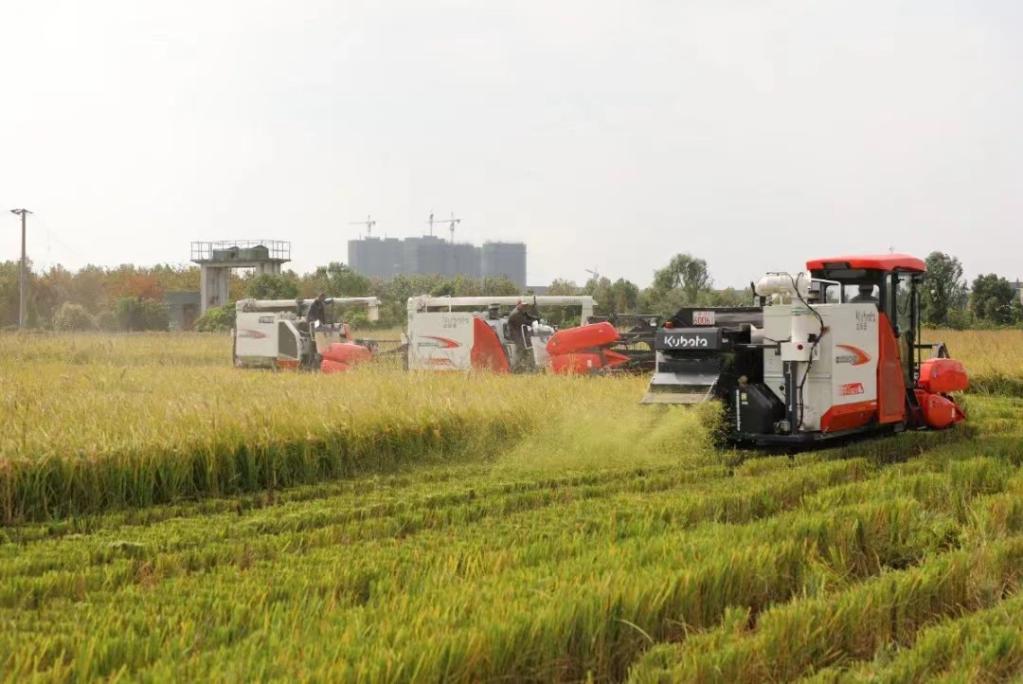 在枫泾镇下坊村新禹坊农产品专业合作社的稻田里,农户们正熟练地操作着收割机穿梭其中。伴随着机器轰鸣声,稻穗被收割机不断“收入囊中”,经过脱粒处理后,秸秆从机器尾部落下,所有工序一气呵成。