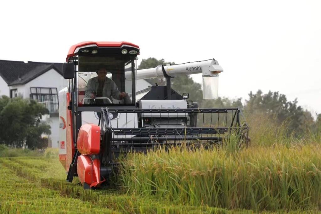 近日,上海市金山区枫泾镇下坊村的农户正在操作收割机在田间收获稻米。(受访者供图)