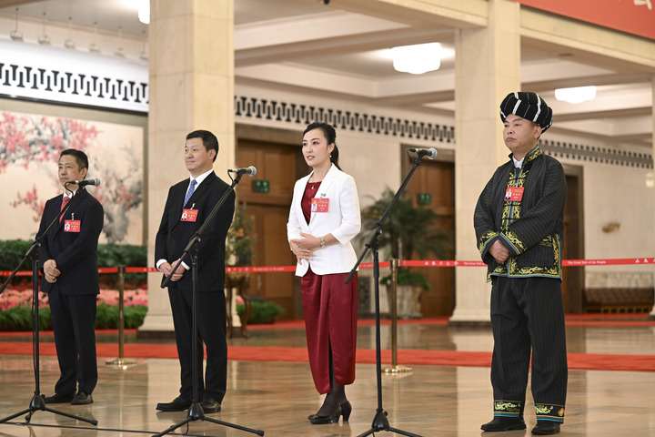 周海江、李国璋、张燕、施金通代表(自左至右)在“党代表通道”接受采访。新华社记者 金良快 摄