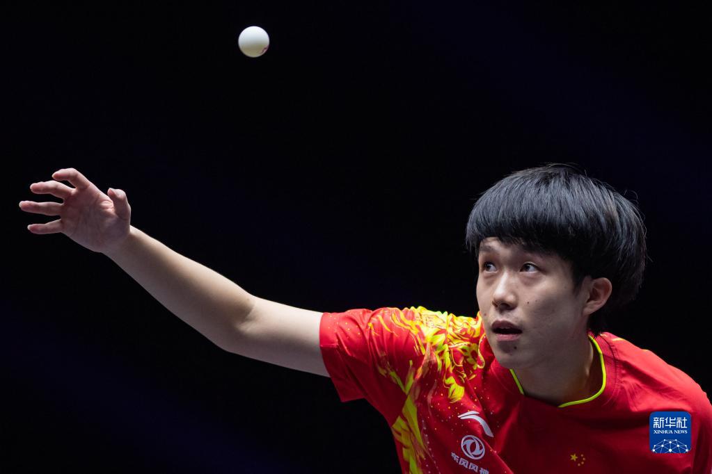 10月22日,王楚钦在比赛中发球。新华社记者张金加摄
