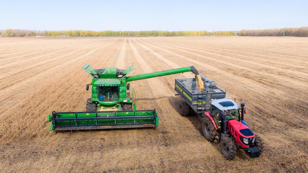 黑龙江北大荒农业股份有限公司友谊分公司大豆收获现场。新华社发(周立军摄)