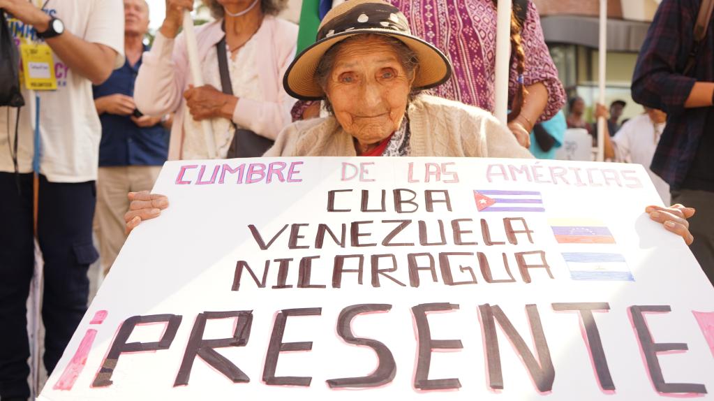 “人民请起来,消灭制裁!”上千名示威者在第九届美洲峰会会场外高呼口号,抗议美国政府延续对古巴等美洲国家的制裁政策。