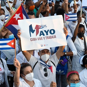 5月1日,古巴民众在哈瓦那参加“五一”国际劳动节集会游行。古巴多地5月1日举行“五一”国际劳动节集会游行,上百万民众走上街头,反对美国对古封锁,表达爱国情感,并向古巴医疗工作者和科研人员致敬。新华社发(华金·埃尔南德斯摄)
