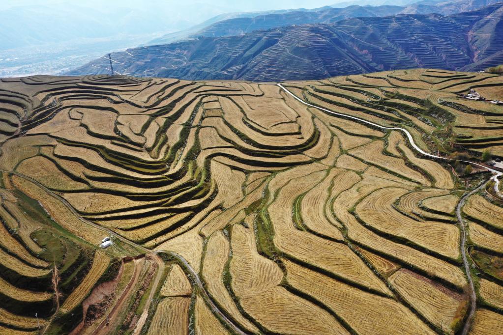 这是10月19日拍摄的青海省黄南藏族自治州同仁市黄乃亥乡日秀玛村的燕麦田(无人机照片)。新华社记者 陈杰 摄