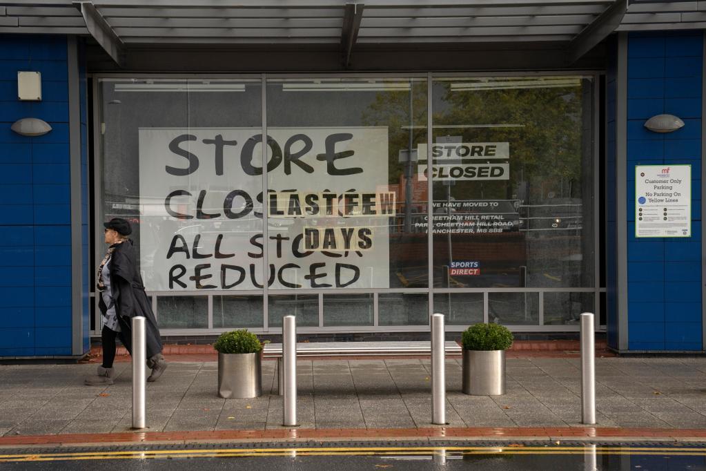 10月7日,在英国曼彻斯特,一名行人走过一家关闭的店铺。新华社发(乔恩·休珀摄)