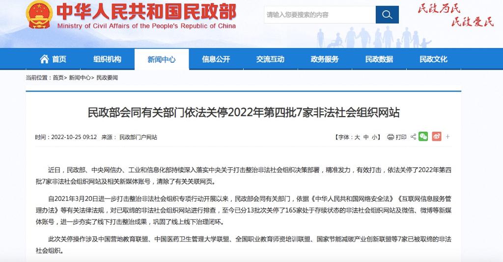 记者25日从民政部获悉,民政部、中央网信办、工业和信息化部近日依法关停了中国医药卫生管理大学联盟等2022年第四批7家非法社会组织网站及相关新媒体账号,清除了有关关联网页。