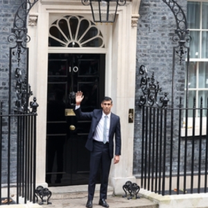 10月25日,新就任的英国首相里希·苏纳克发表讲话后在伦敦唐宁街10号首相府前挥手致意。 新华社记者李颖摄