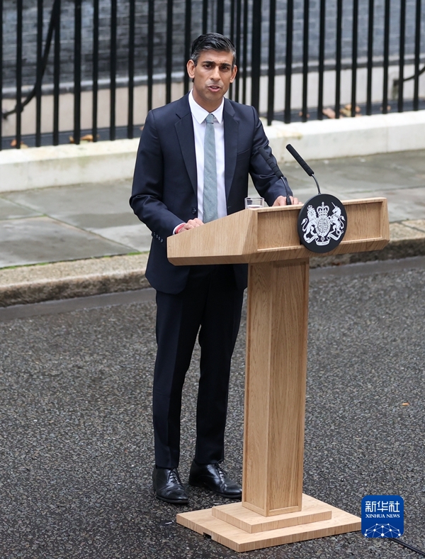 10月25日,里希·苏纳克在英国伦敦唐宁街10号首相府前发表讲话。 新华社记者李颖摄