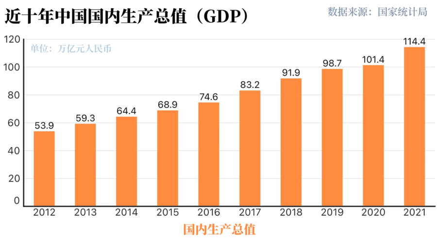 从53.9万亿元到114.4万亿元,这是从2012年到2021年中国经济总量的跃升速度,目前稳居世界第二。
